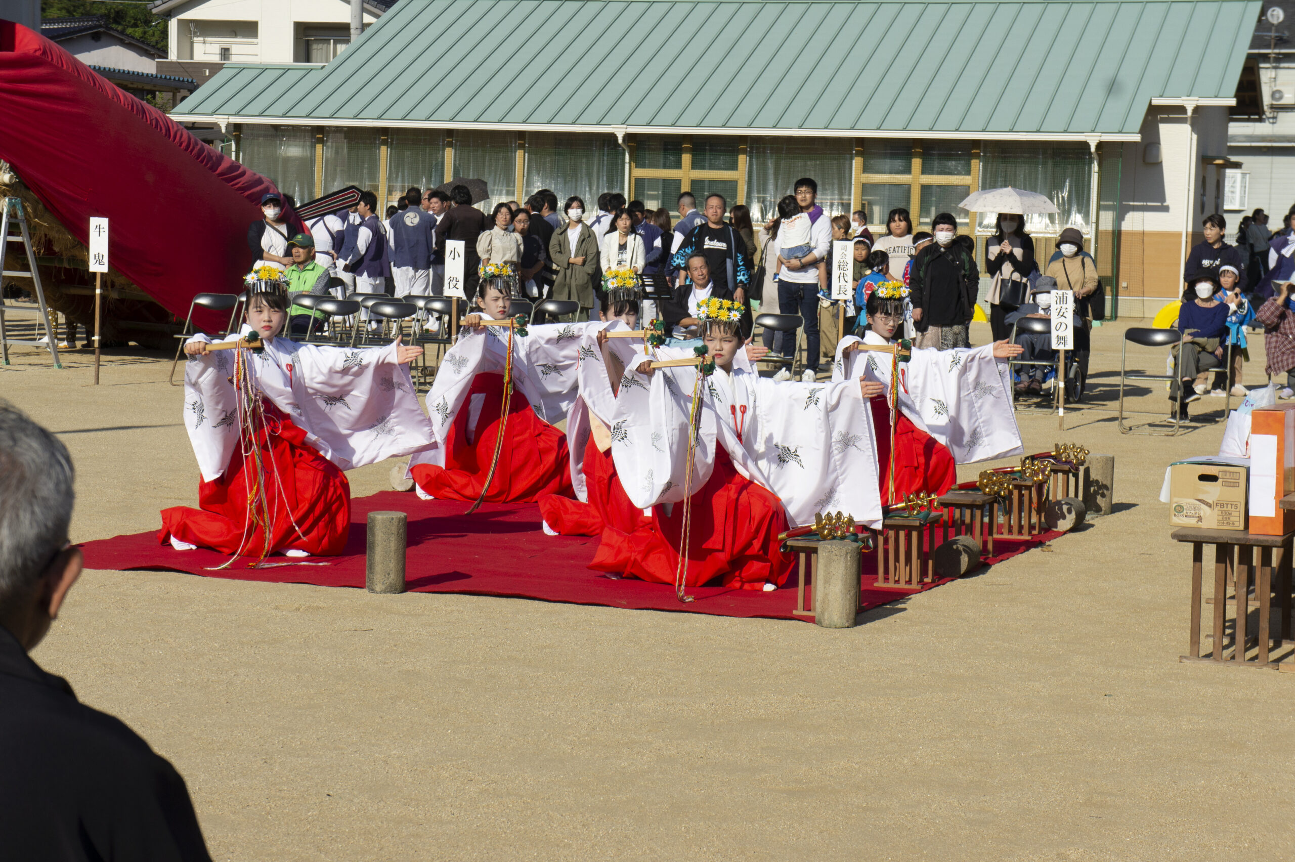伊方の秋祭りは、本祭りの19日に牛鬼、山車、五ツ鹿、唐獅子、稚児の舞など各地区の出し物がそれぞれの地区を練りながら、伊方小学校に一堂に会し、披露奉納されます。