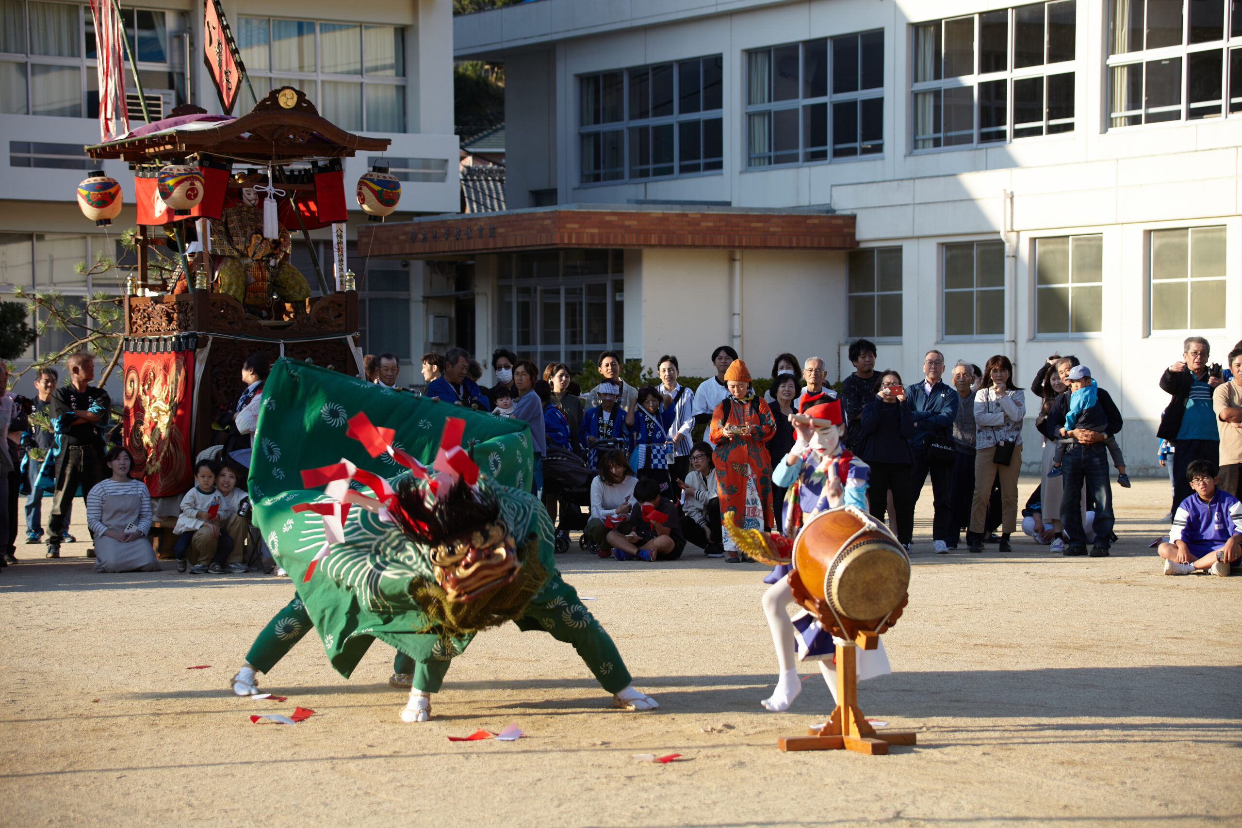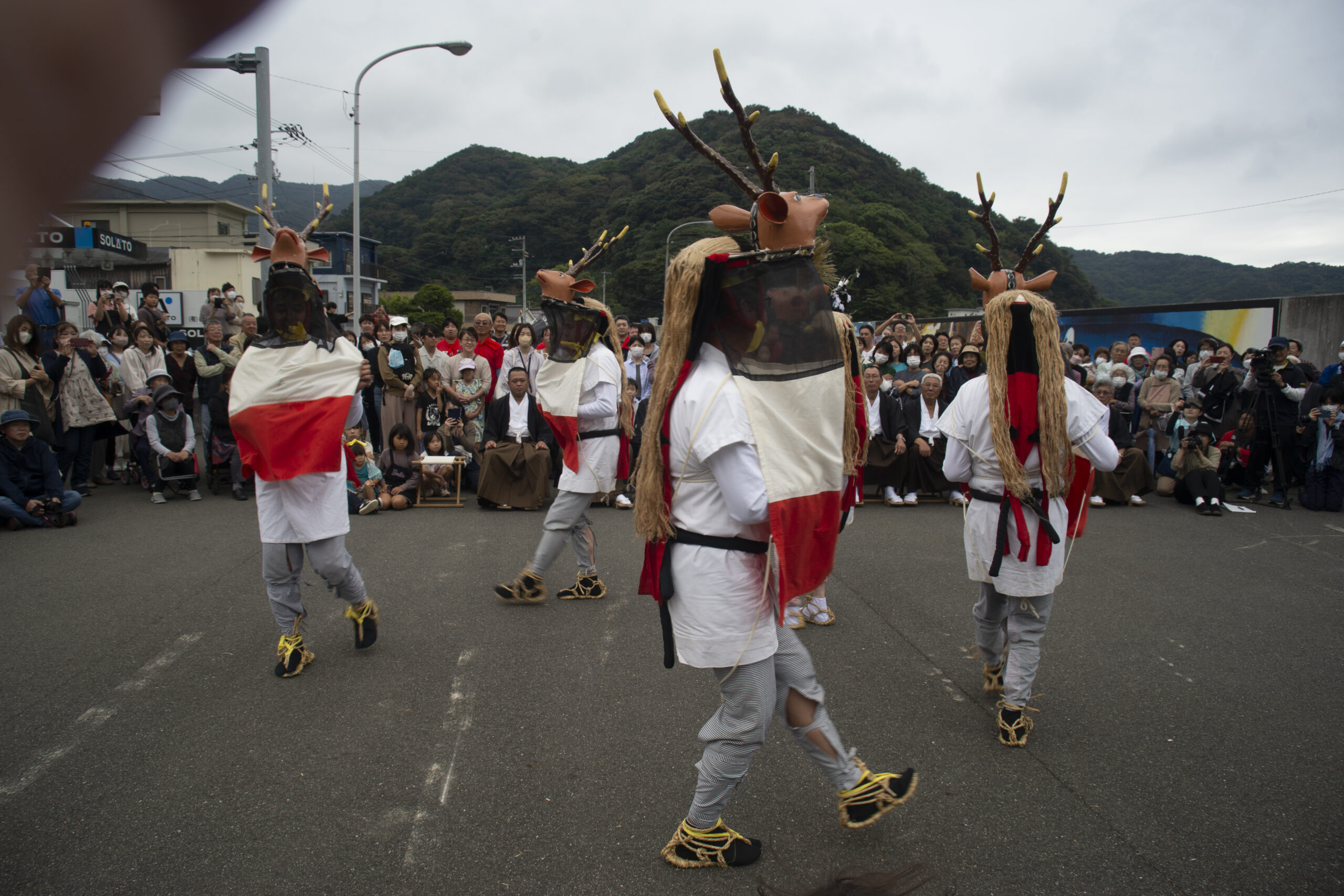 五ツ鹿、唐獅子は地区内を踊り歩いた後、地区中心部の「お旅所」前で披露奉納されますが、特に東西の唐獅子2体が同時に舞う踊りは圧巻です。