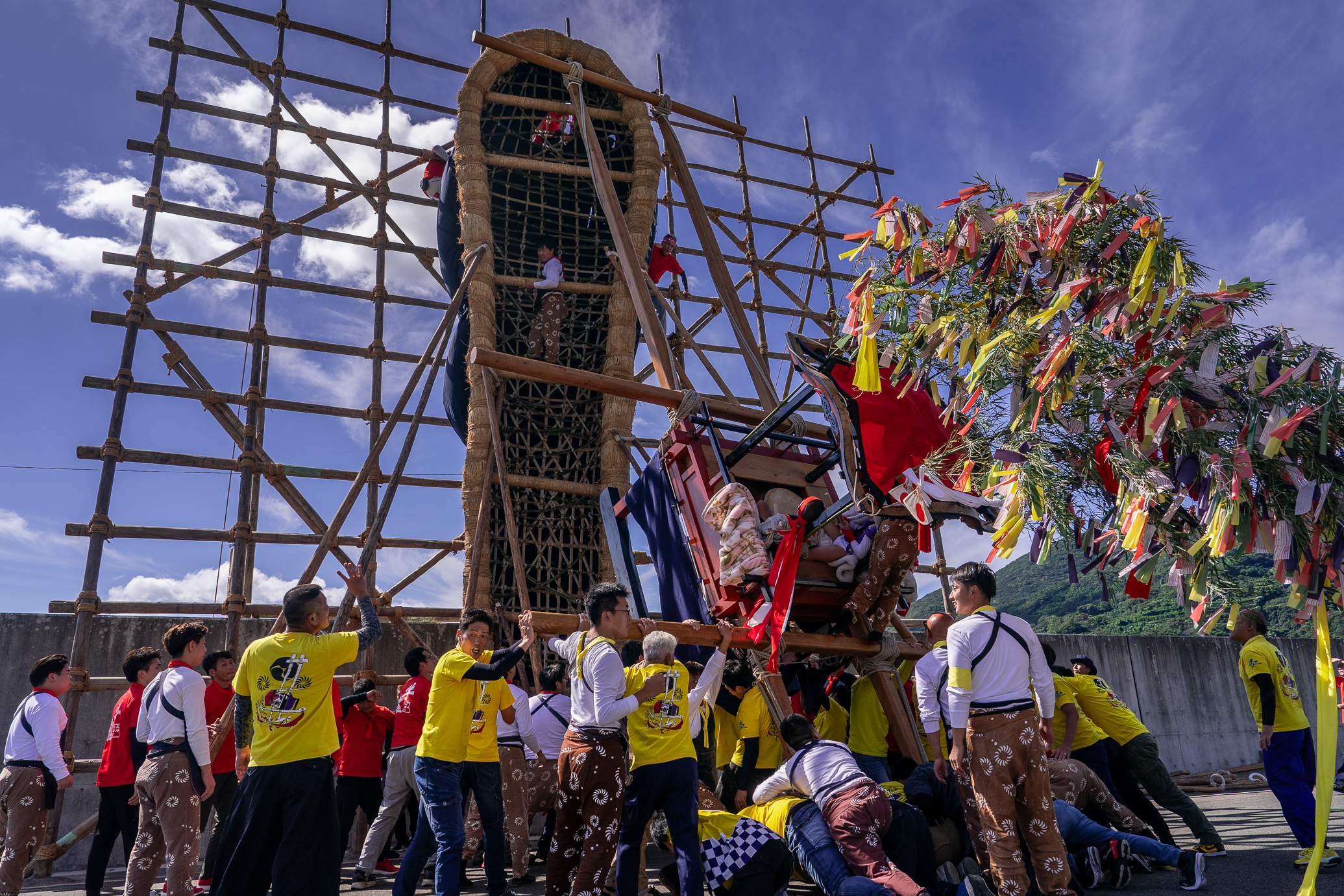 全長約10mの牛鬼と約10m×4mの四ツ太鼓をヤグラに立てて一気に倒しますが、この時、四ツ太鼓にはまだ子供が乗ったまま!